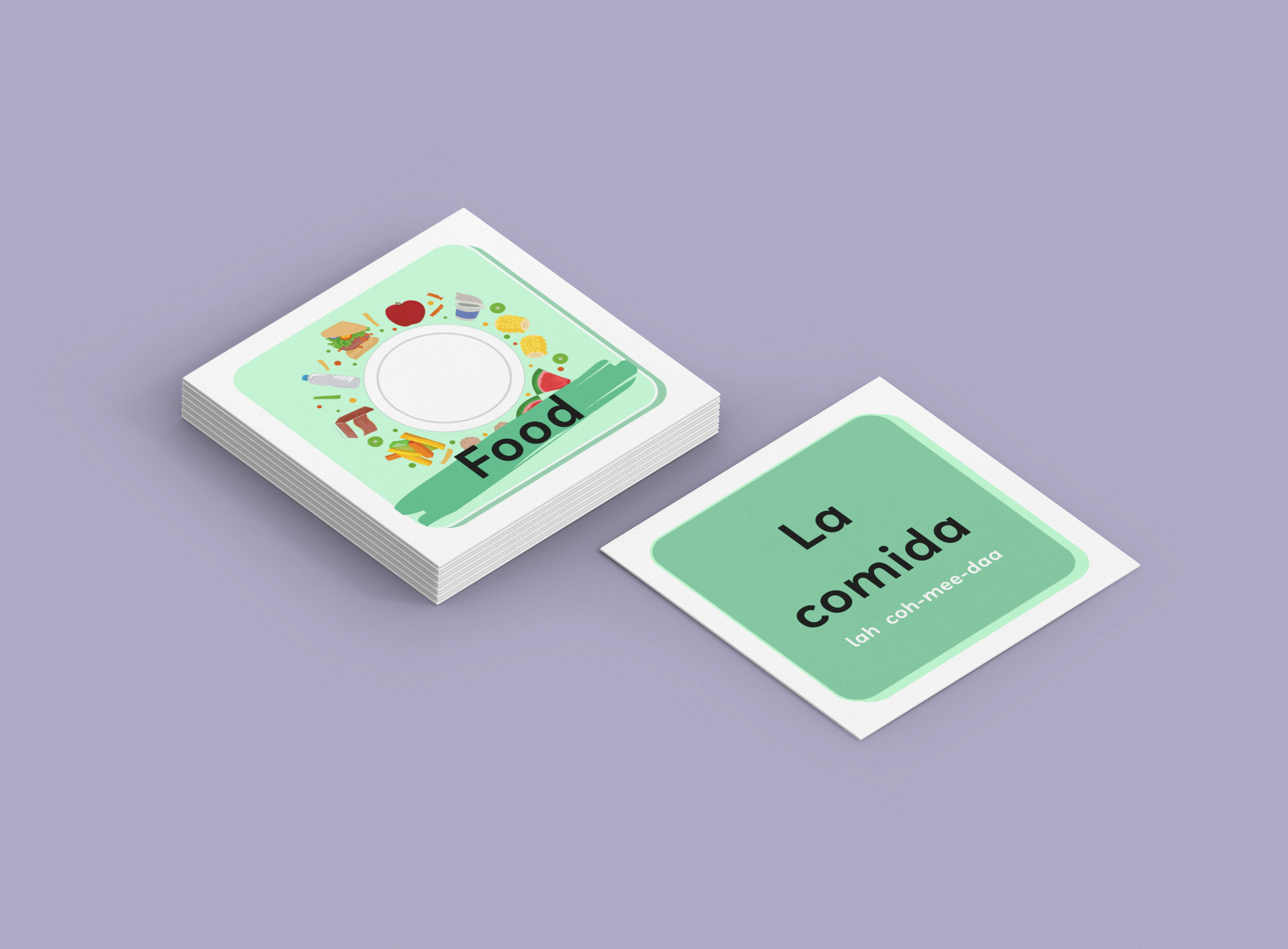 Parents can help their child learn a particular topic from our perfected designed flashcards that has visual stimulus and english vocabulary on one side and Spanish vocabulary with phonetic pronunciation on the other side.